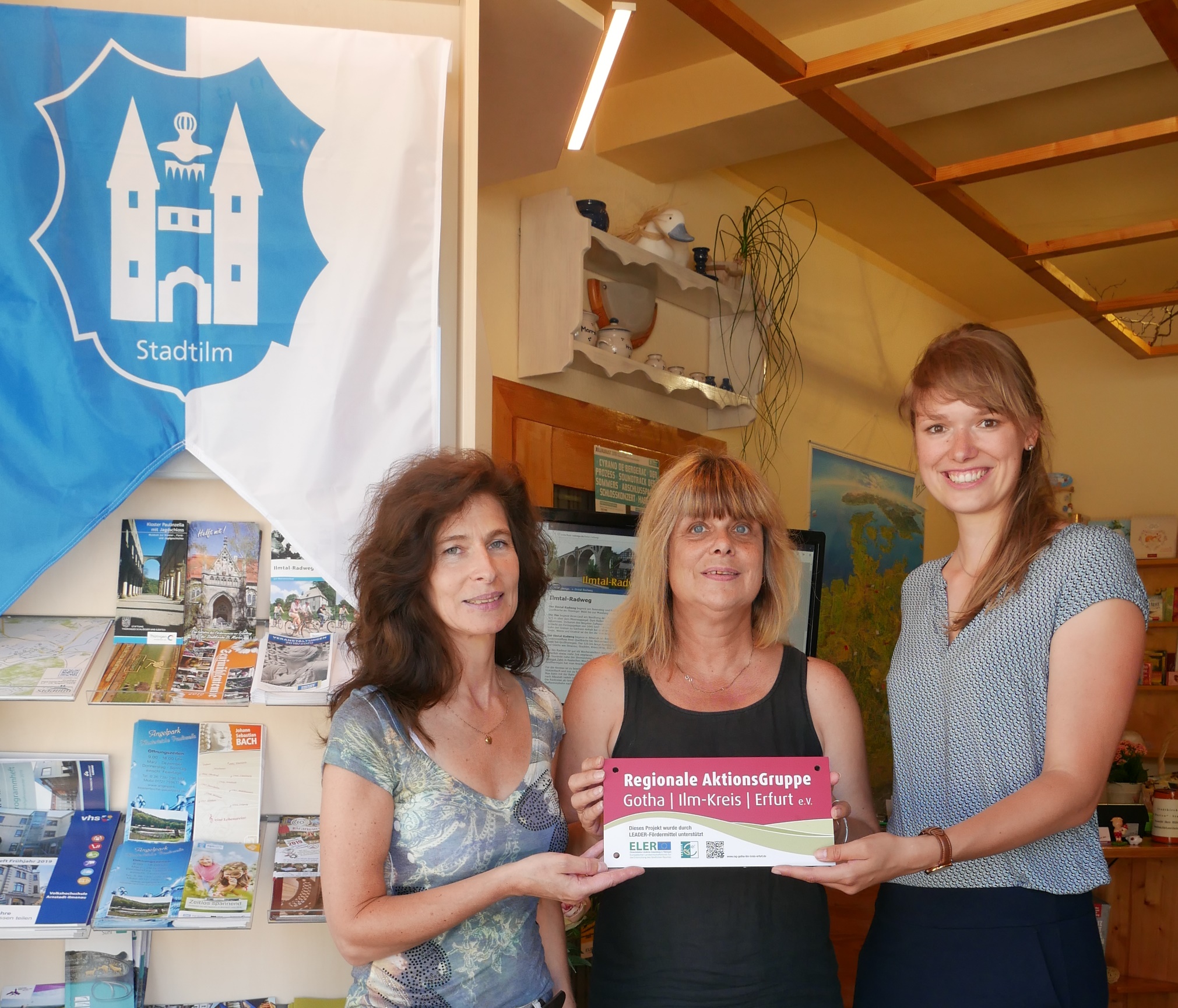 Seit gestern ist nun im Literarischen Reformhaus in Stadtilm das erste ausgehändigte Förderschild anzutreffen. 2016 wurde die Stadtinformation in das Reformhaus integriert. Seitdem stehen dank den langen Öffnungszeiten und der Lage am Marktplatz Interessierten Informationen zu Veranstaltungen, Kultureinrichtungen und touristischen Angebote zur Verfügung. Die von der Stadtverwaltung angeschaffte Ausstattung, die Installation eines WLAN-Hotspots und eines Touch-Screen-Bildschirms wurden zu 75 % mit LEADER-Fördermitteln finanziert.